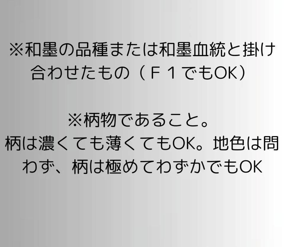 自分の育てた好きな和墨血統めだかを多くの人に見てもらう展覧会であって品評会ではないため、賞を狙うことが重要ではありません。思い出つくりとしてお気軽に出品してください。